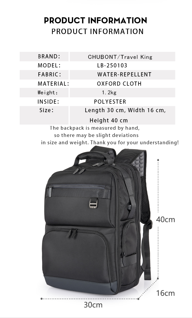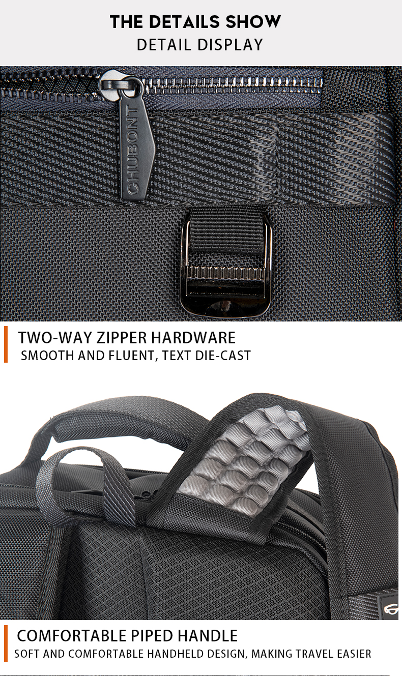 This model from CHUBONT-LUGGAGE incorporates materials and construction methods that ensure durability and structural integrity suitable for rigorous daily use. The backpack features a padded laptop sleeve and multiple organizational pockets, designed for efficient space utilization and equipment protection. Its ergonomic design includes adjustable shoulder straps and a ventilated back panel, reducing fatigue and enhancing user comfort. While precise weight and dimensions are proprietary, this business backpack complies with cross-border travel requirements, supporting secure storage and accessibility. As a product of an experienced bag manufacturer, it benefits from stringent quality control and OEM capability, ensuring consistent specifications and product reliability.